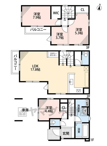 LDK17.8畳(2F)、洋4.4畳(1F)、洋7.9畳(3F)、洋5.3畳(3F)、洋3.7畳(3F) |