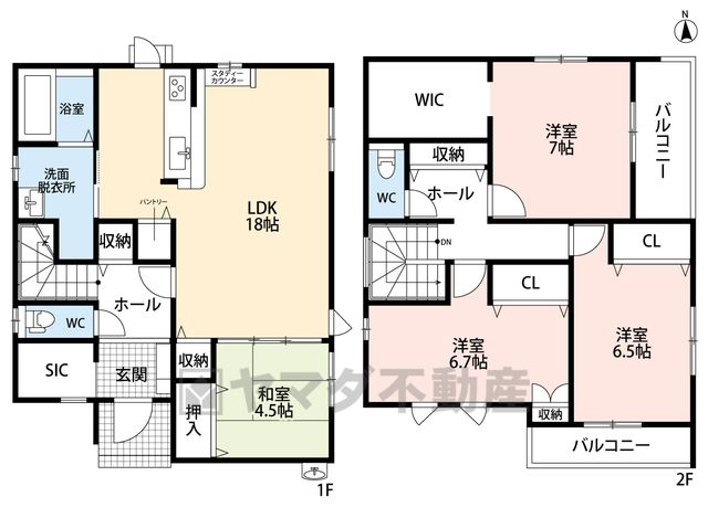 LDK18畳(1F)、和4.5畳(1F)、洋7畳(2F)、洋6.7畳(2F)、洋6.5畳(2F) |
