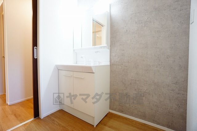 三面鏡つき洗面台。収納も一体型になっているので、ドライヤーやヘアアイロンの置き場に困りませんね。