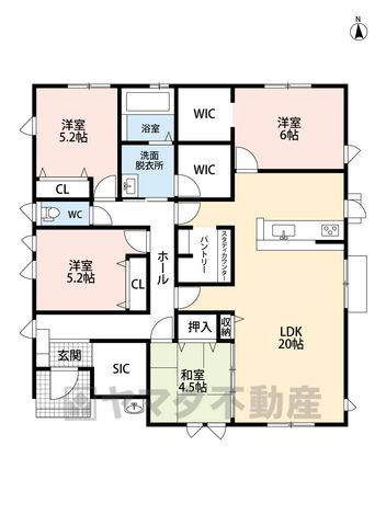 LDK20畳(1F)、和4.5畳(1F)、洋6畳(1F)、洋5.2畳(1F) |