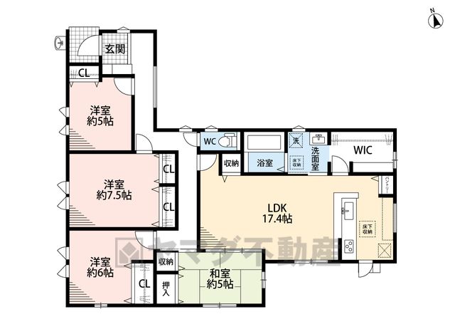 LDK17.4畳(1F)、和5畳(1F)、洋7.5畳(1F)、洋6畳(1F)、洋5畳(1F) |