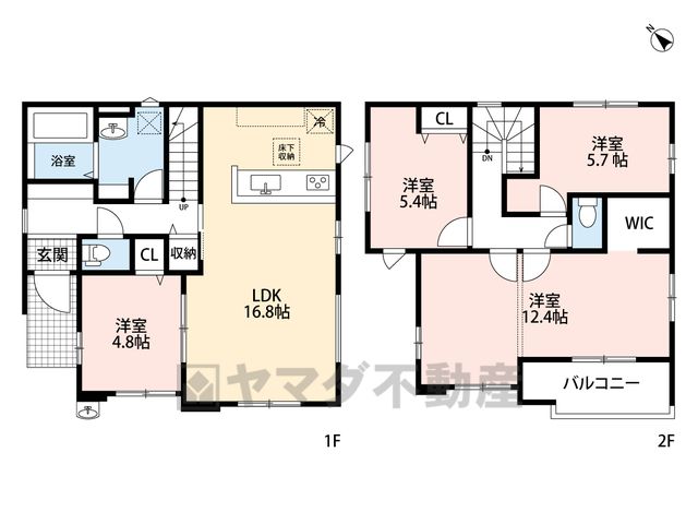 LDK16.8畳(1F)、洋4.8畳(1F)、洋12.4畳(2F)、洋5.7畳(2F)、洋5.4畳(2F) |