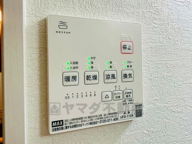 雨の日の洗濯も安心できる浴室暖房乾燥機付き浴室。リモコンで操作もボタン1つで簡単。 浴室暖房乾燥機には、暖房、乾燥、涼風、換気の4つの機能が付いています。タイマー付きです。
