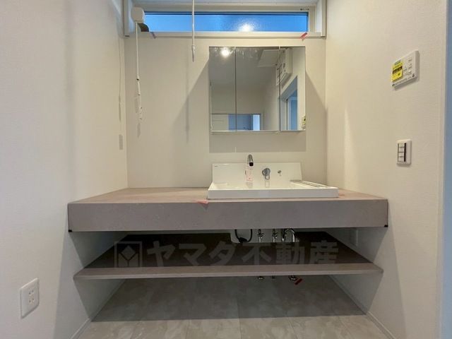 三面鏡つき洗面台。収納も一体型になっているので、ドライヤーやヘアアイロンの置き場に困りませんね。