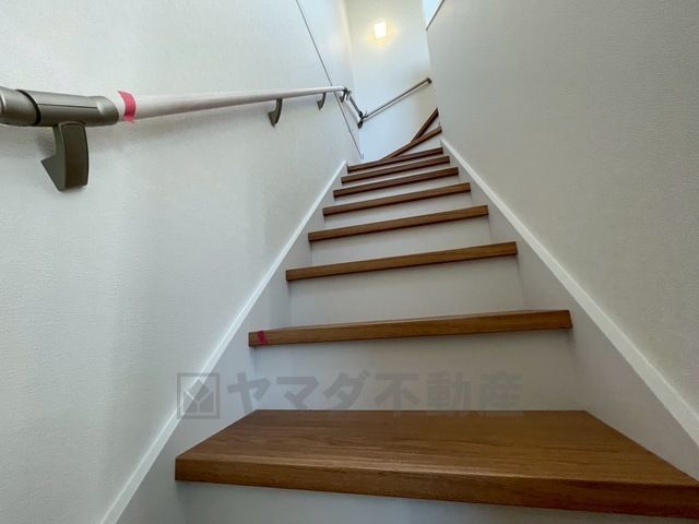 ご年配の方でも安心できる、手すり付き階段です^^段差も低めで設定されてますので安全性にも優れてますね^^