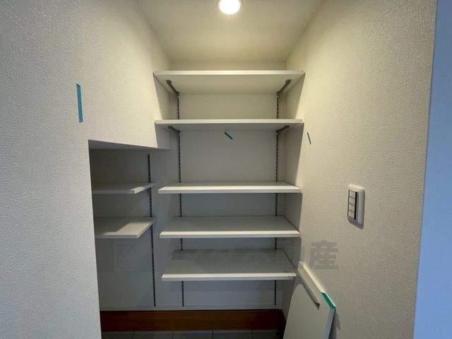キッチン横パントリー。まとめ買いした食品やインターネットでケース購入した飲料水なども、ストックしておくのに便利です。