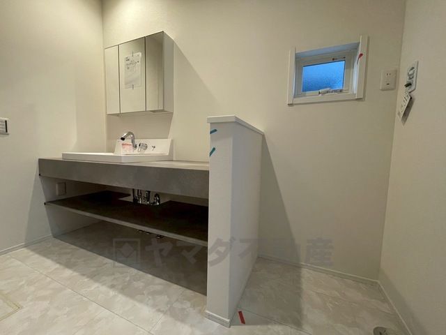 三面鏡つき洗面台。収納も一体型になっているので、ドライヤーやヘアアイロンの置き場に困りませんね。