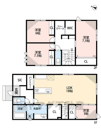 LDK18畳(1F)、洋3畳(1F)、洋7.5畳(2F)、洋6畳(2F) |