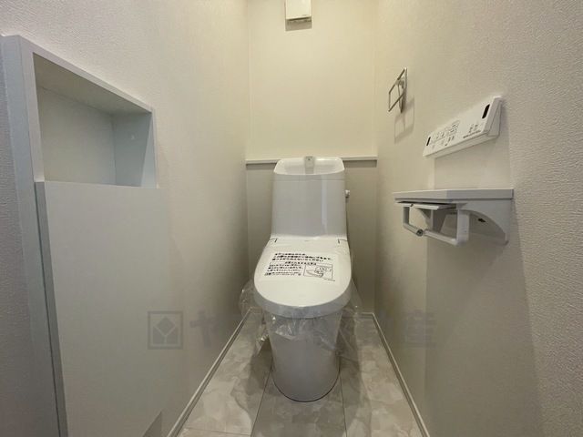 温水洗浄機付トイレです。節水機能もあるので、安心して使えますね。もちろん、1階2階の2ヶ所にトイレがあるので、忙しい朝にもゆとりができますね。