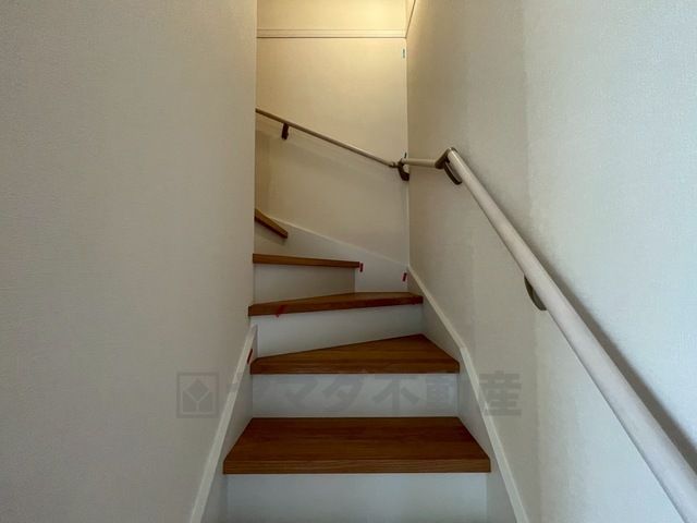 ご年配の方でも安心できる、手すり付き階段です^^段差も低めで設定されてますので安全性にも優れてますね^^