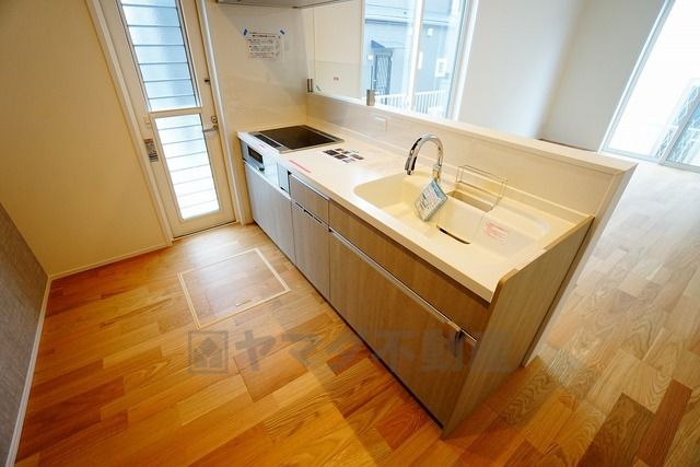 同仕様写真。対面式カウンターキッチンでお子様の様子が見守れます。カウンタートップは耐熱性に優れており、日ごろのお掃除もふき取るだけでOK。ステンレスシンクも簡単にお掃除できますよ。