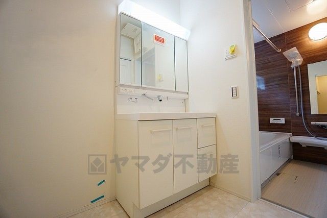 同仕様写真。三面鏡つき洗面台。収納も一体型になっているので、ドライヤーやヘアアイロンの置き場に困りませんね。