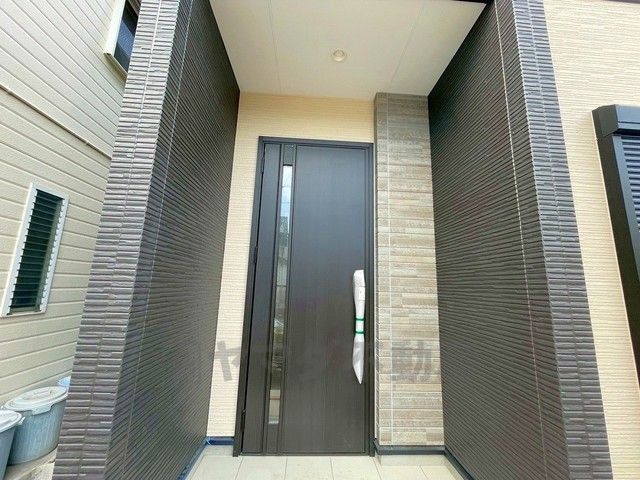 木目調がとてもお洒落なタッチキータイプの玄関ドアです。奥まって設置されているので、雨に濡れる心配もありません。