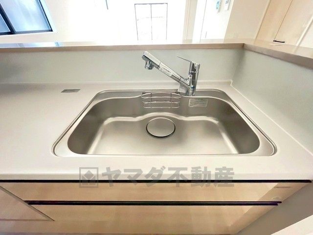 広々とした凸型シンクに洗剤ポケットを標準装備。大きなお鍋など洗いやすいです。洗剤や石鹸、スポンジもすっきりできる収納付き。