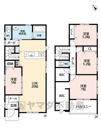 LDK20畳(1F)、洋5畳(1F)、洋7畳(2F)、洋5.2畳(2F) |