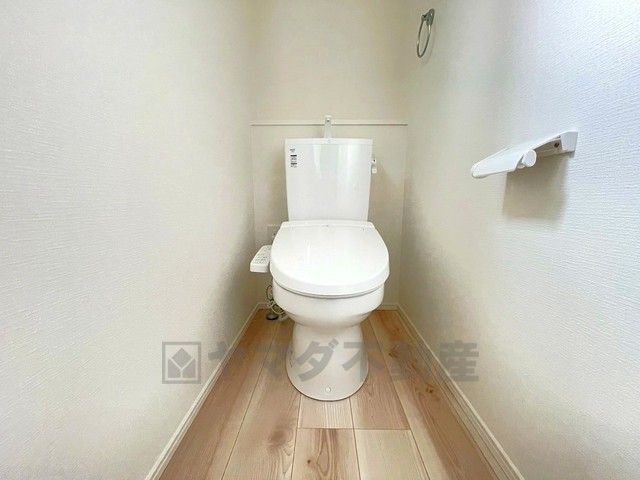 同仕様写真。温水洗浄機付トイレです。節水機能もあるので、安心して使えますね。もちろん、1階2階の2ヶ所にトイレがあるので、忙しい朝にもゆとりができますね。