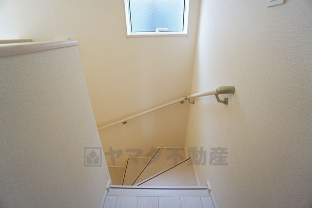 ご年配の方でも安心できる、手すり付き階段です^^段差も低めで設定されてますので安全性にも優れてますね^^