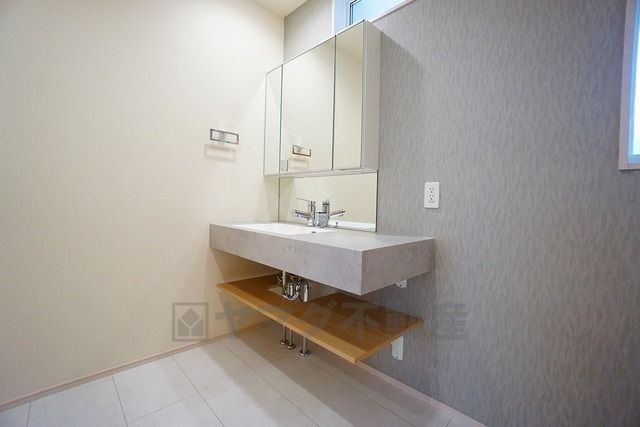 三面鏡つき洗面台。収納も一体型になっているので、ドライヤーやヘアアイロンの置き場に困りませんね。