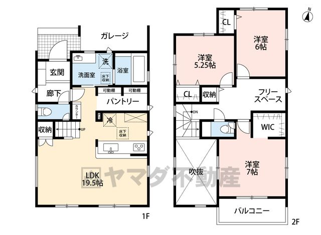 LDK19.5畳(1F)、洋7畳(2F)、洋6畳(2F)、洋5.2畳(2F) |