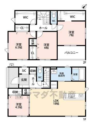 LDK18畳(1F)、洋4.5畳(1F)、洋7畳(2F)、洋6.5畳(2F)、洋6畳(2F) |