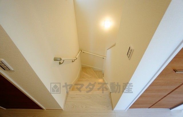 同仕様写真。ご年配の方でも安心できる、手すり付き階段です^^段差も低めで設定されてますので安全性にも優れてますね^^