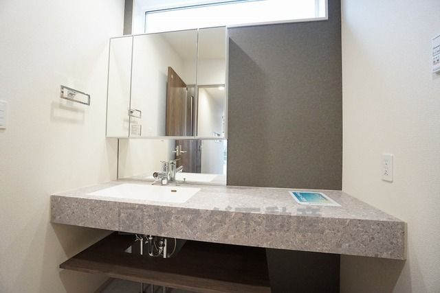 三面鏡つき洗面台。鏡裏にたっぷりとした収納スペースがあります。鏡を閉めてしまえば小物は見えないため、スッキリとした印象の洗面台にできます。