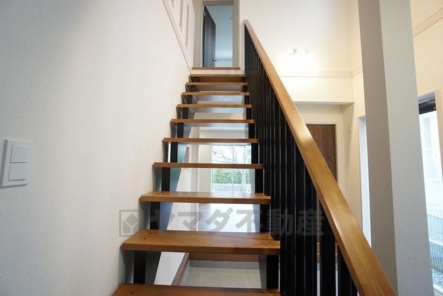 小さなお子様やご高齢の方でも安心できる、手すり付き階段。段差も低めで設定されており、安全性にも優れています。