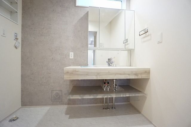 三面鏡つき洗面台。鏡裏にたっぷりとした収納スペースがあります。鏡を閉めてしまえば小物は見えないため、スッキリとした印象の洗面台にできます。