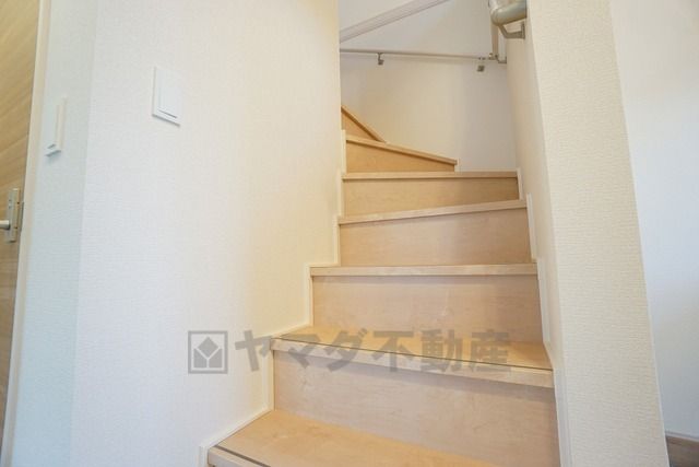 小さなお子様やご高齢の方でも安心できる、手すり付き階段。段差も低めで設定されており、安全性にも優れています。