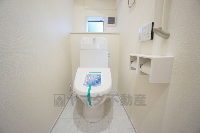 温水洗浄機付トイレです。節水機能もあるので、安心して使えますね。もちろん、1階2階の2ヶ所にトイレがあるので、忙しい朝にもゆとりができますね。