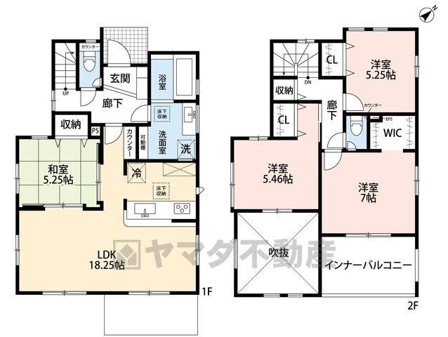 LDK18.2畳(1F)、和5.2畳(1F)、洋5.2畳(2F)、洋5.4畳(2F)、洋7畳(2F) |