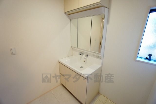 同仕様写真。三面鏡つき洗面台。鏡裏にたっぷりとした収納スペースがあります。鏡を閉めてしまえば小物は見えないため、スッキリとした印象の洗面台にできます。