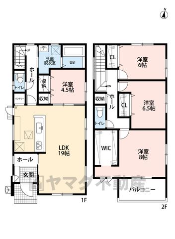 LDK19畳(1F)、洋4.5畳(1F)、洋6畳(2F)、洋6.5畳(2F)、洋8畳(2F) |