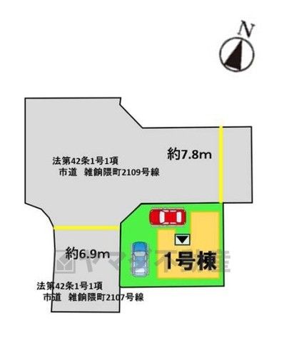 | 土地面積基準 | 実測 | 接道 | 公道 北西 幅員7m 公道 南西 幅員6.9m