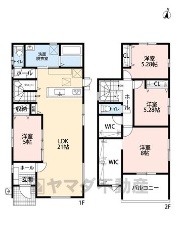 LDK21畳(1F)、洋5畳(1F)、洋5.2畳(2F)、洋8畳(2F) |