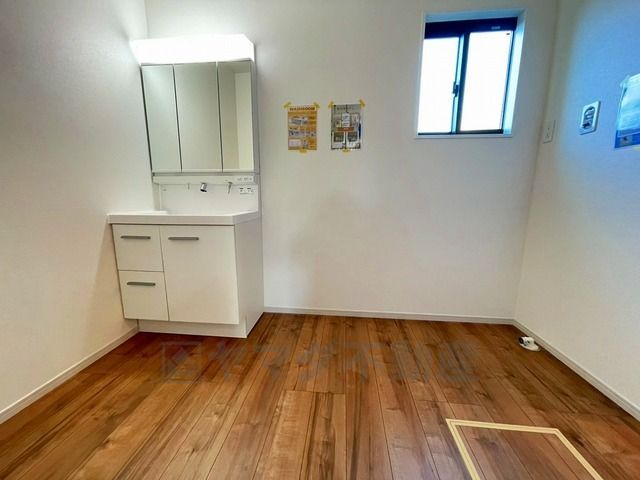 三面鏡つき洗面台。収納も一体型になっているので、ドライヤーやヘアアイロンの置き場に困りませんね。