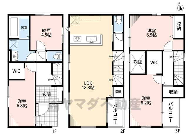 LDK18.3畳(2F)、洋6.8畳(1F)、洋8.2畳(3F)、洋6.5畳(3F)、その他4.5畳(1F) |