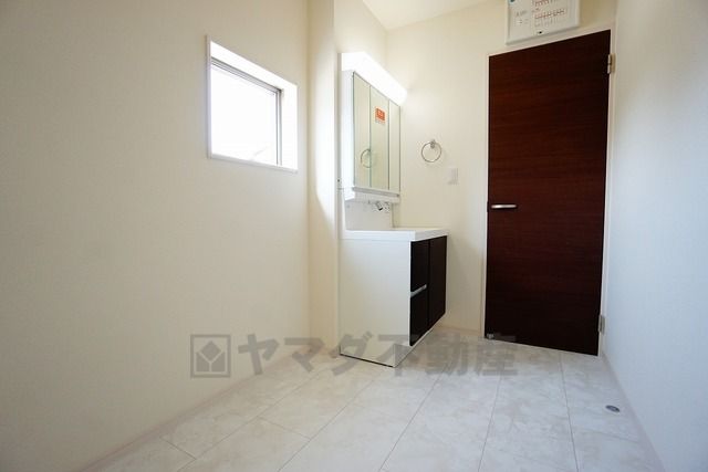 同仕様写真。三面鏡つき洗面台。収納も一体型になっているので、ドライヤーやヘアアイロンの置き場に困りませんね。