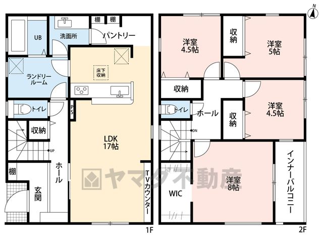 LDK17畳(1F)、洋8畳(2F)、洋5畳(2F)、洋4.5畳(2F) |