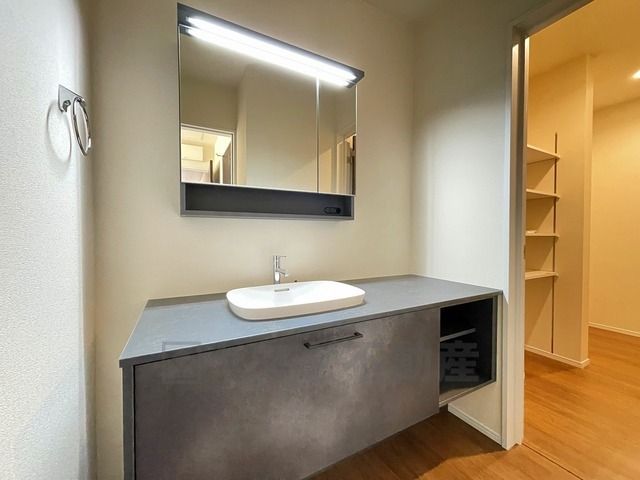 三面鏡つき洗面台。収納も一体型になっているので、ドライヤーやヘアアイロンの置き場に困りませんね。