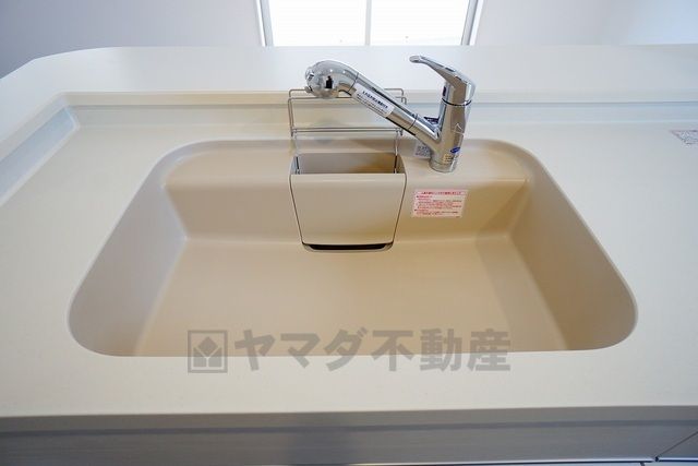 同仕様写真。広々とした凸型シンクに洗剤ポケットを標準装備。大きなお鍋など洗いやすいです。洗剤や石鹸、スポンジもすっきりできる収納付き。