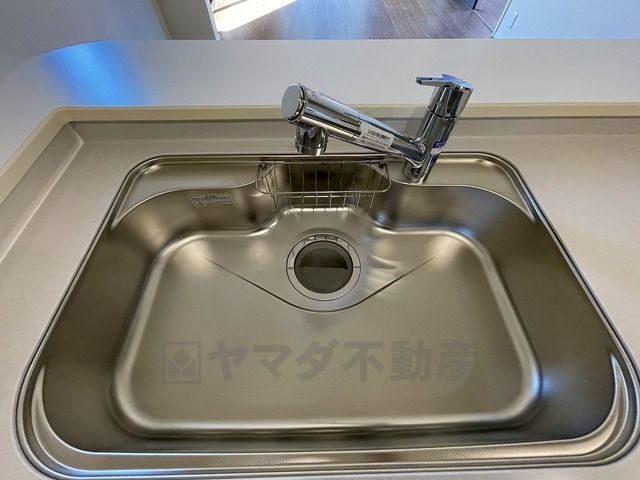 広々とした凸型シンクに洗剤ポケットを標準装備。大きなお鍋など洗いやすいです。洗剤や石鹸、スポンジもすっきりできる収納付き。
