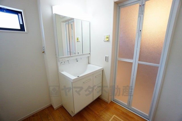 同仕様写真。三面鏡つき洗面台。収納も一体型になっているので、ドライヤーやヘアアイロンの置き場に困りませんね。
