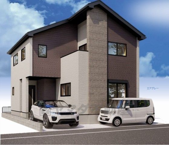 完成予想図。グレーを基調としたシンプルで飽きの来ない外観です。 10年間の瑕疵保証が付いた安心の新築戸建。最新の設備で気持ちの良い新生活を送りませんか。