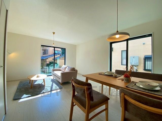 大きな窓のあるリビングは、陽光あふれる明るい空間です。居心地良く、ご家族皆がゆったり寛げる憩いの空間となりそうです。