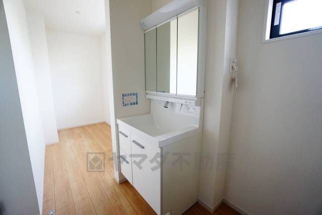 三面鏡つき洗面台。収納も一体型になっているので、ドライヤーやヘアアイロンの置き場に困りませんね。