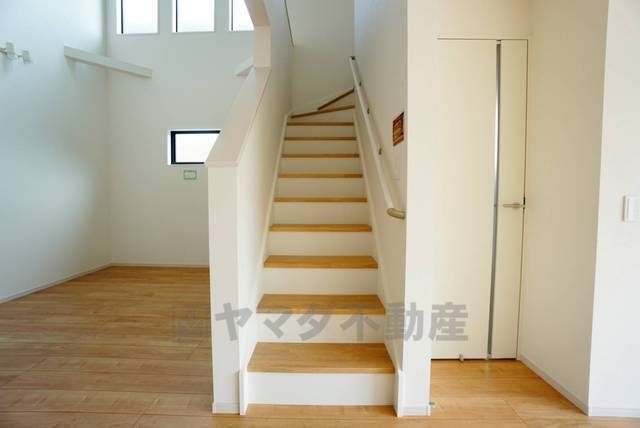 ご年配の方でも安心できる、手すり付き階段です^^段差も低めで設定されてますので安全性にも優れてますね^^