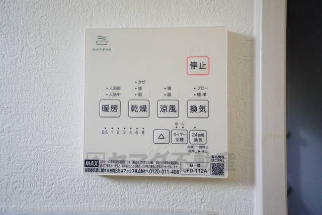 雨の日の洗濯も安心できる浴室暖房乾燥機付き浴室。リモコンで操作もボタン1つで簡単。 浴室暖房乾燥機には、暖房、乾燥、涼風、換気の4つの機能が付いています。タイマー付きです。