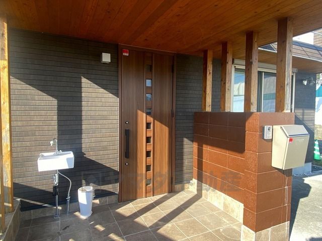 ブラウントーンの玄関扉^^外壁とマッチングしていてかっこいいですね^^家の顔となる玄関扉がかっこいいと、たくさんの人を招き入れたくなりますね^^