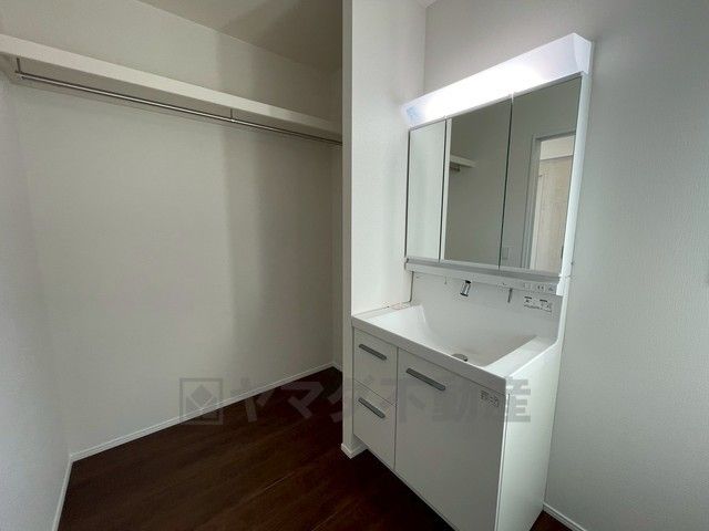 三面鏡つき洗面台。収納も一体型になっているので、ドライヤーやヘアアイロンの置き場に困りませんね。